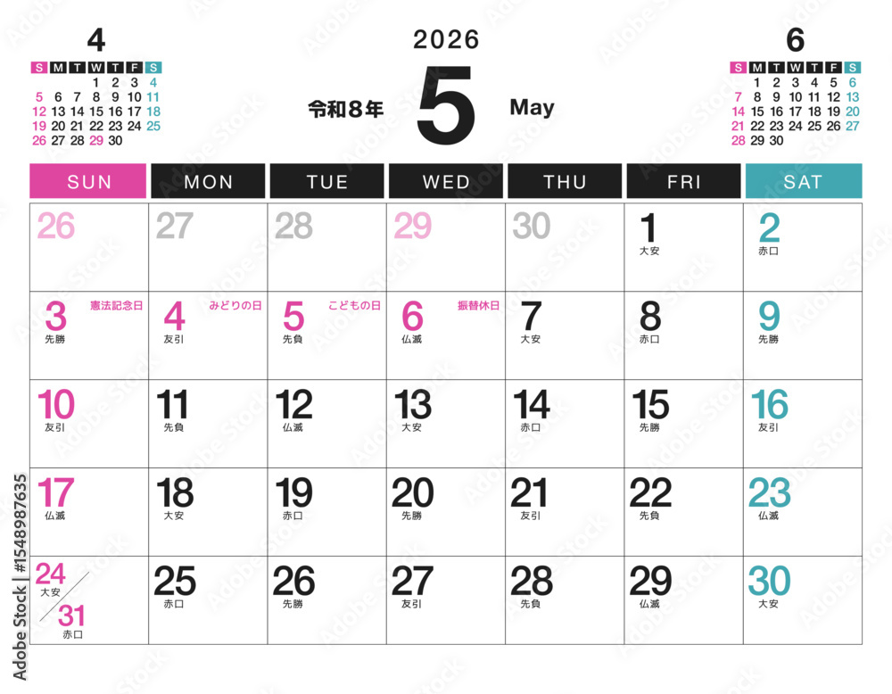 Foto 2026年 カレンダー 5月 令和8年 祝日・六曜