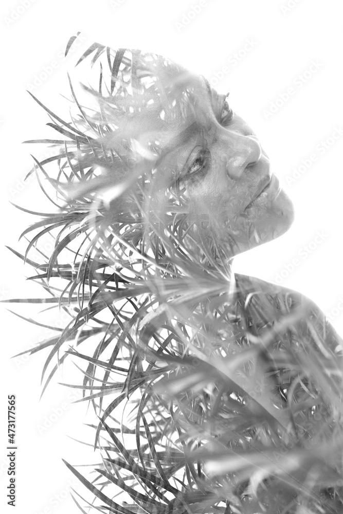 Foto A black an white portrait of an African American woman combined with an image of foliage in a double exposure technique