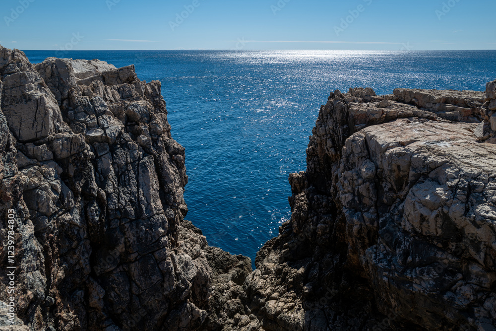 Foto A breathtaking view of the deep blue ocean seen through a gap between two rocky cliffs on a sunny day