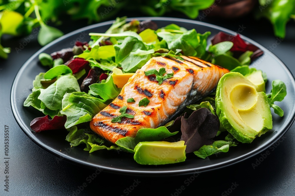 Foto A healthy, portioned salad with grilled salmon, mixed greens, and avocado, showing a light, balanced meal perfect for diet control