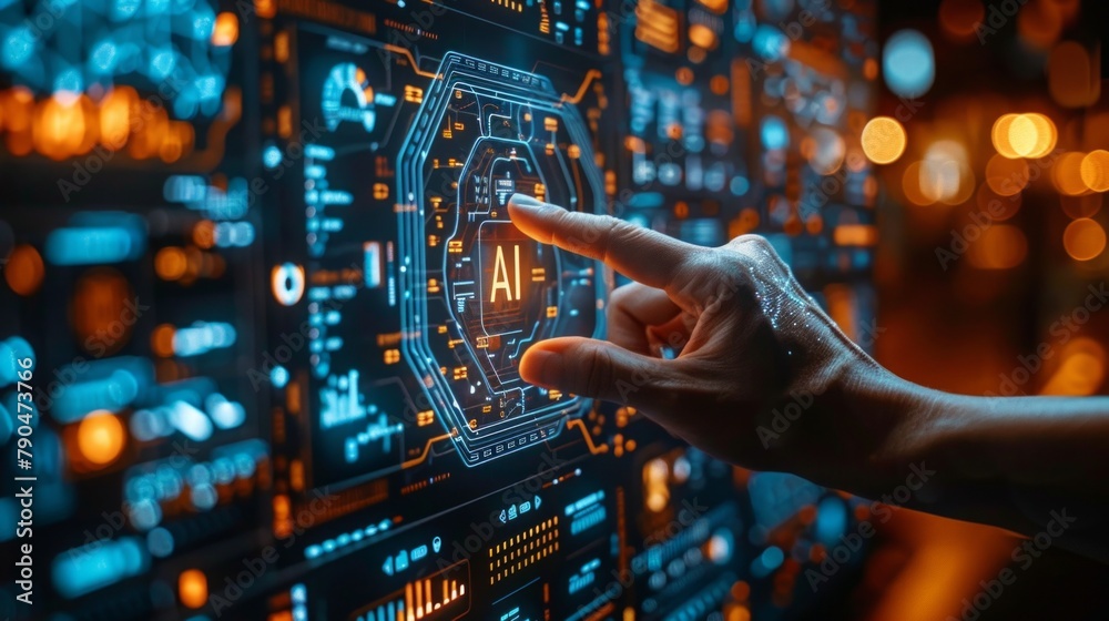 Foto A human hand touching 'AI' on a futuristic touchscreen, AI Generative