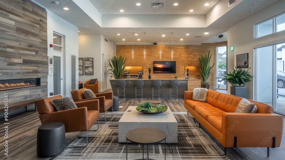 Foto a living room with a couch, chairs, a table and a bar in it with a television on