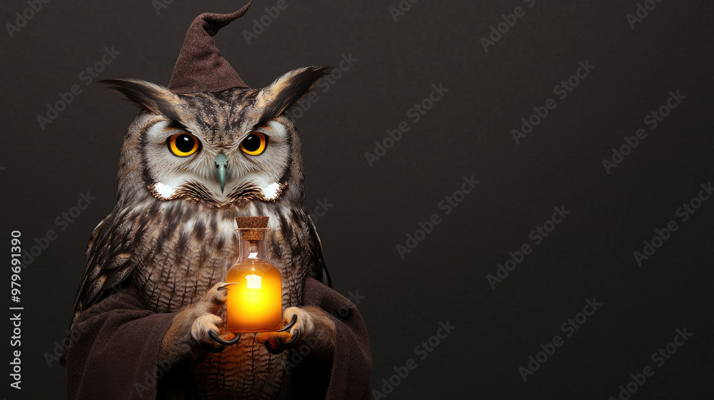 Foto A mysterious owl dressed as a witch holds a glowing potion bottle, embodying magic and enchantment in a captivating scene perfect for fantasy themes