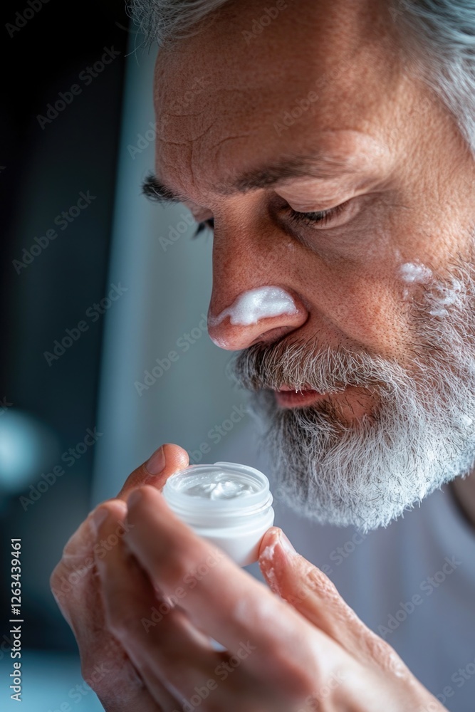 Foto A person with a beard holds a container filled with whipped cream