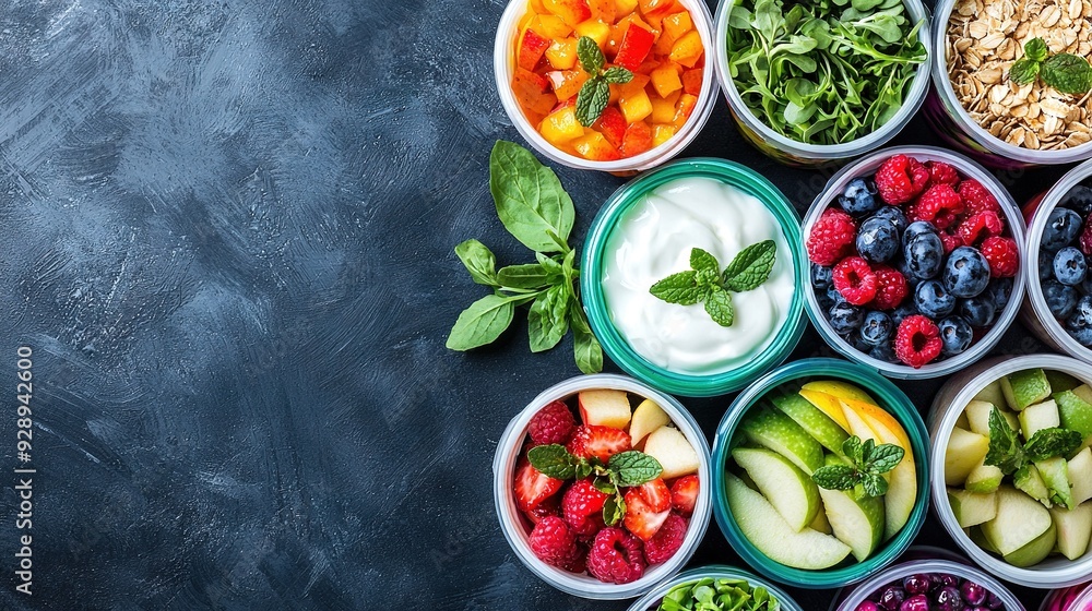 Foto A variety of fruits and yogurt are arranged in small bowls on a black surface,
