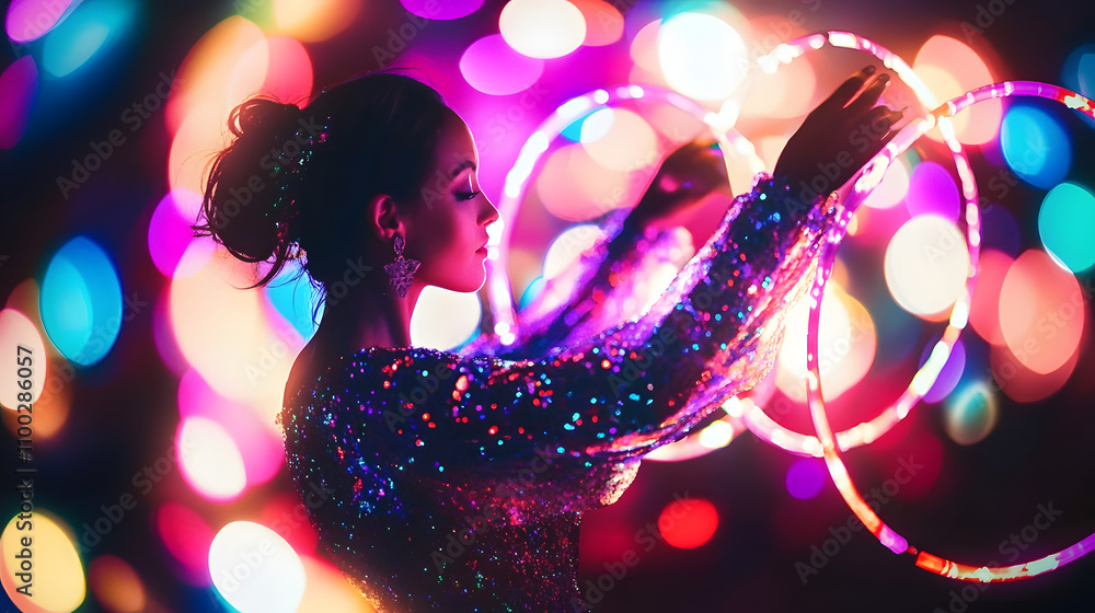 Foto A woman in a sparkly outfit performs with glowing hoops in a dark space with blurred colorful lights in the background