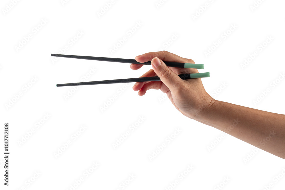 Adesivo murale Black chopsticks for rice and hand on a transparent background