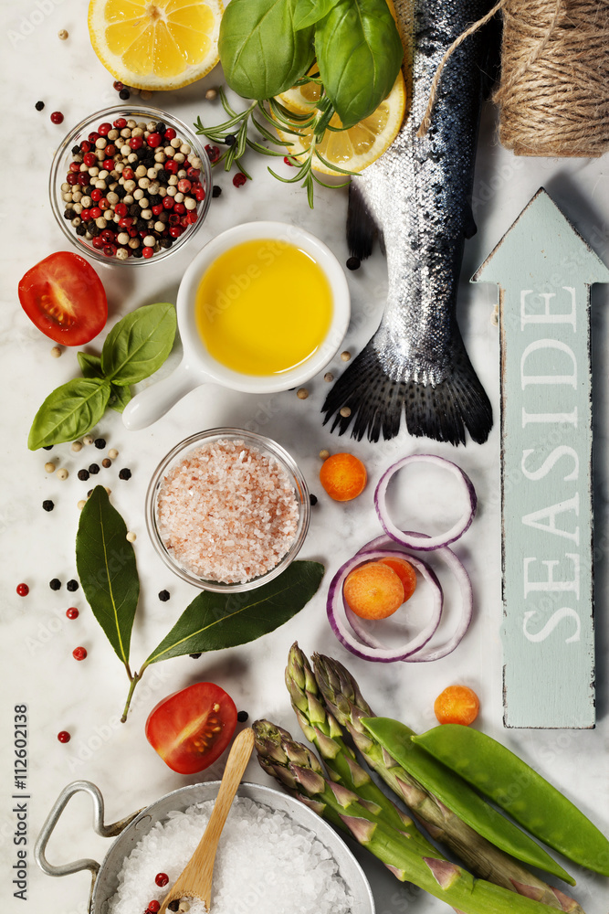 Adesivo murale Raw rainbow trout with vegetables, herbs and spices