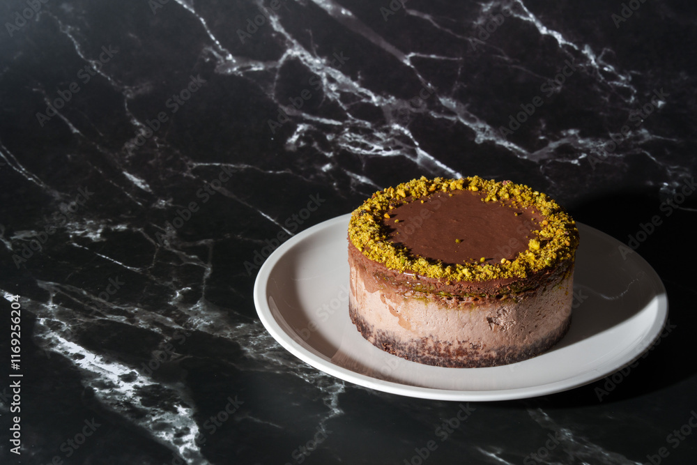 Adesivo murale Dubai chocolate cheesecake with pistachio paste and kataifi dough filling covered in chocolate ganache on white plate
