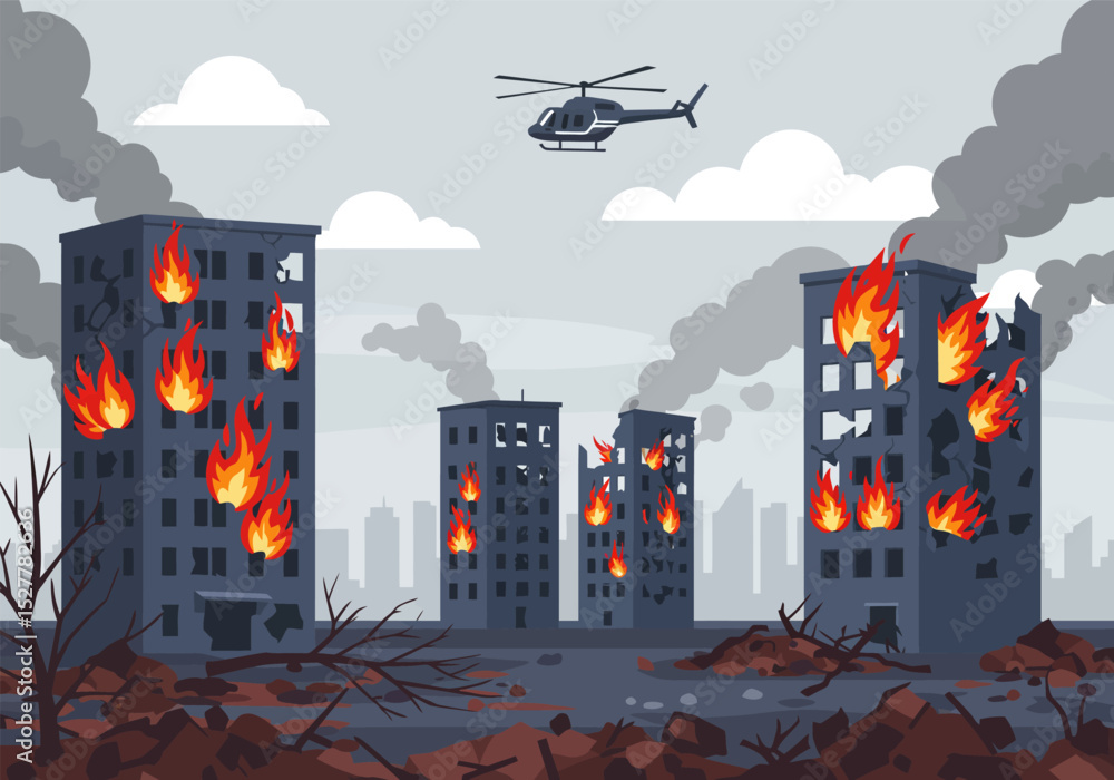 Adesivo murale Vector illustration of several destroyed buildings and fires due to warfare