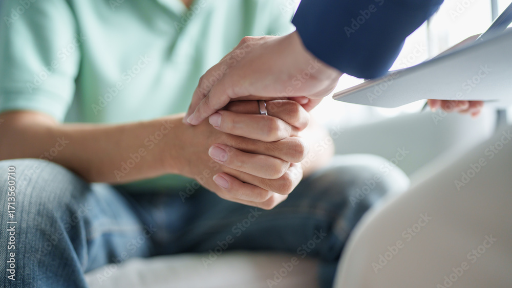Adesivo murale sad male sitting on sofa Patient discussing mental health issues with psychologist