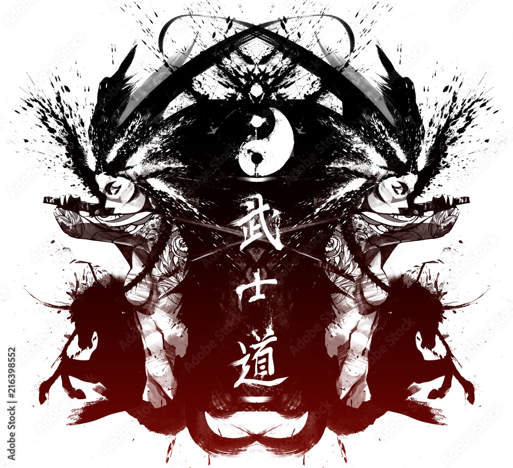 Adesivo murale Beautiful samurai girls with Katanas,The inscription in Japanese means the way