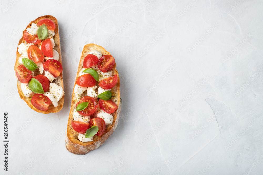 Adesivo murale Bruschetta with tomatoes, mozzarella cheese and basil on a light background