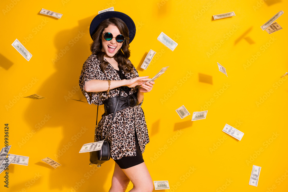 Adesivo murale Photo of positive crazy girl spend waste usd cashback credit bank profit air fly