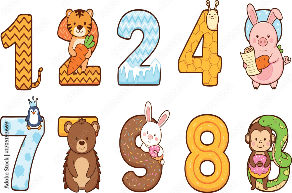 Foto Animal number vector set, cartoon digits 1–9 illustration, educational character