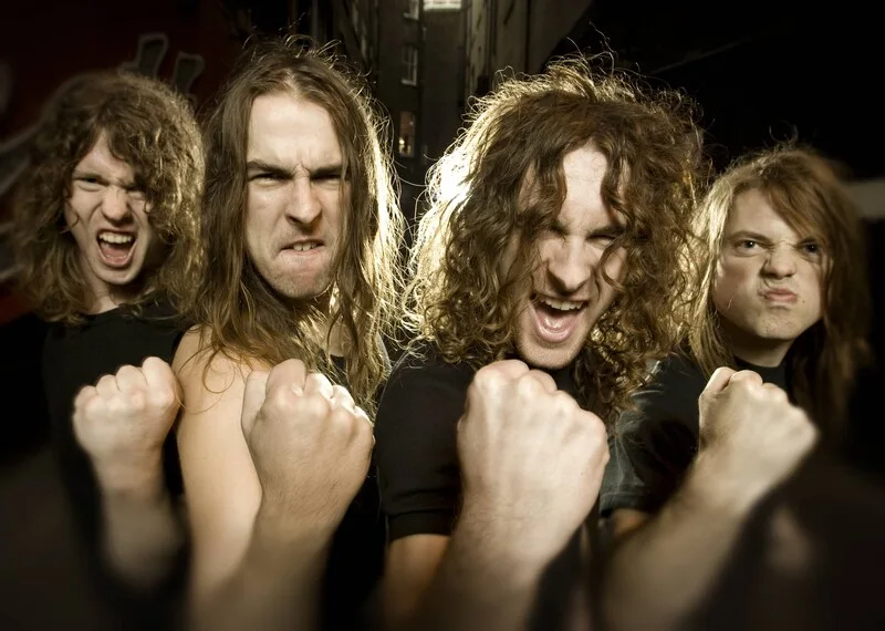 Posed group portrait of Australian rock band Airbourne. Left to right are David Roads, Ryan O'Keeffe, Joel O'Keeffe and Justin Street in London, England on February 18 2008. (Photo by Nigel Crane/Redferns)