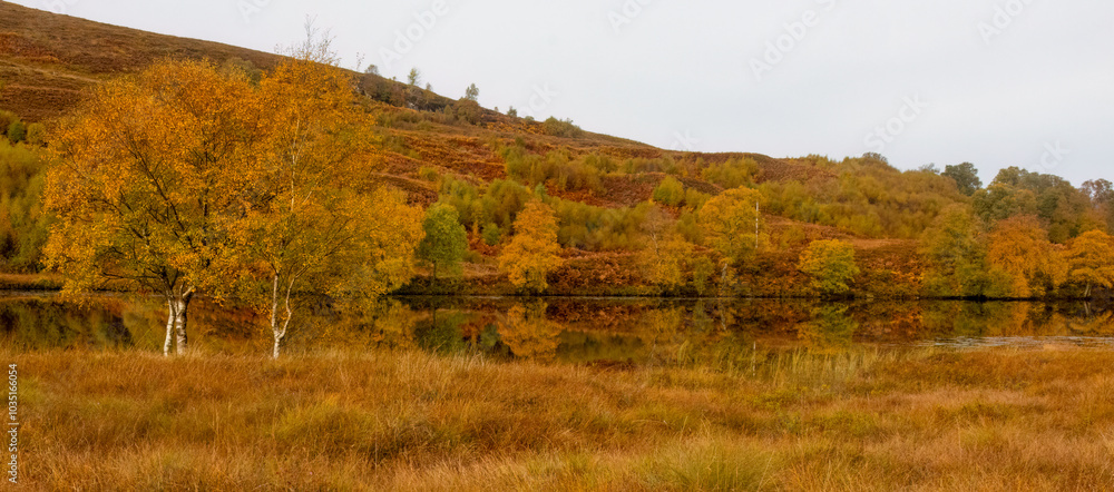 Foto Beautiful autumn tree reflection on a still loch in the highlands of Scotland