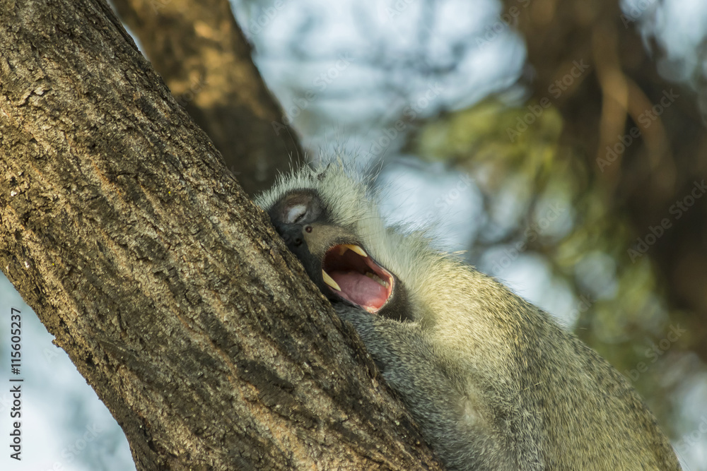 Foto Big sleepy vervet monkey yawning in a tree in late afternoon sun