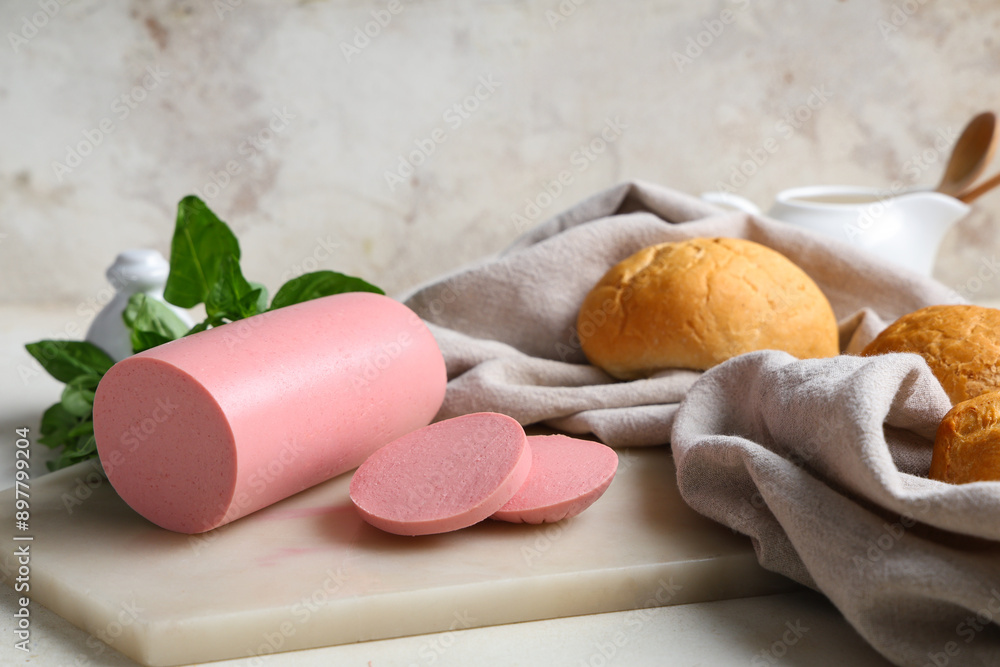 Foto Board with slices of tasty boiled sausage, bread and basil on grunge grey backgr