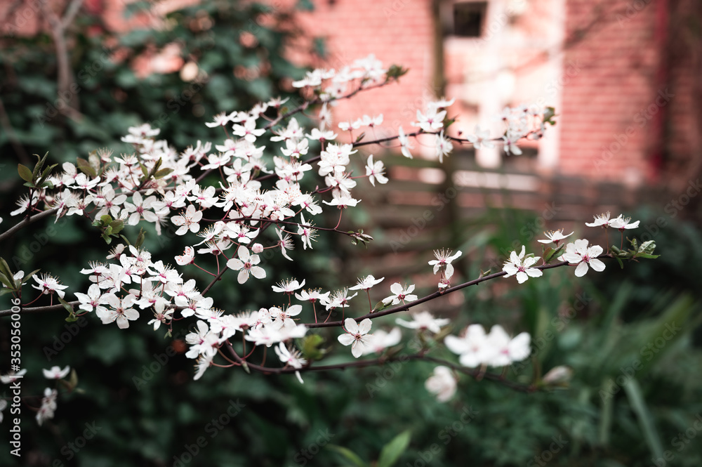 Foto Branches of fresh cherry tree blossom in a garden against dark bokeh background