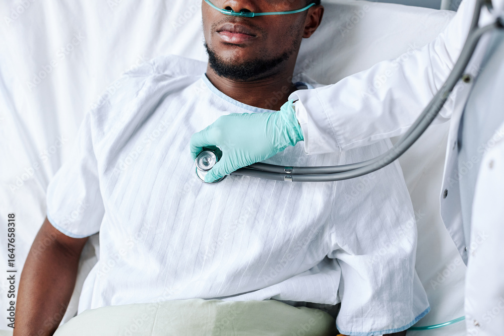 Carta da parati High angle view of unrecognizable doctor using stethoscope to listen to heart an