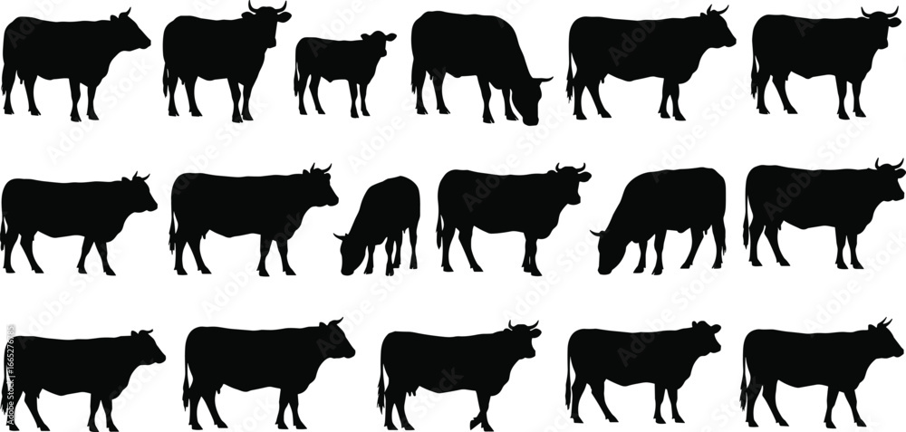 Carta da parati Cow and calf silhouette set, black vector livestock icons, grazing and standing