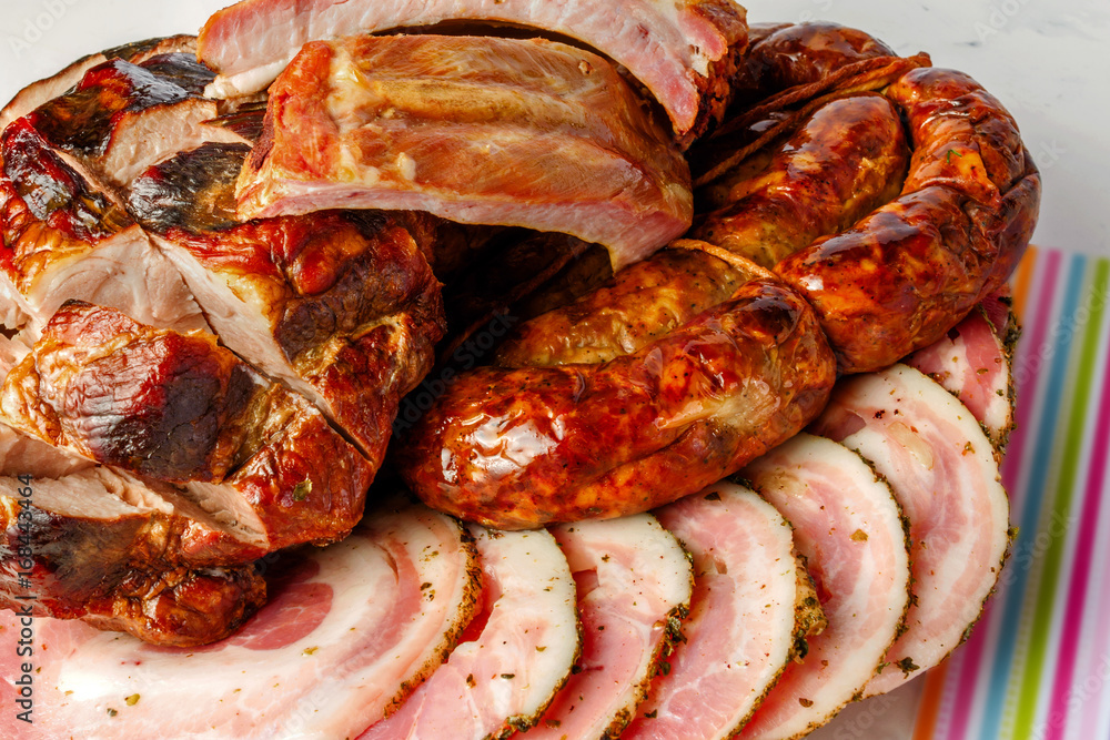 Carta da parati Homemade sausage, smoked ribs and sliced meatloaf