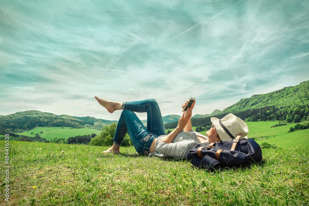 Carta da parati Woman leasure around the mountains with her phone and shootinh b