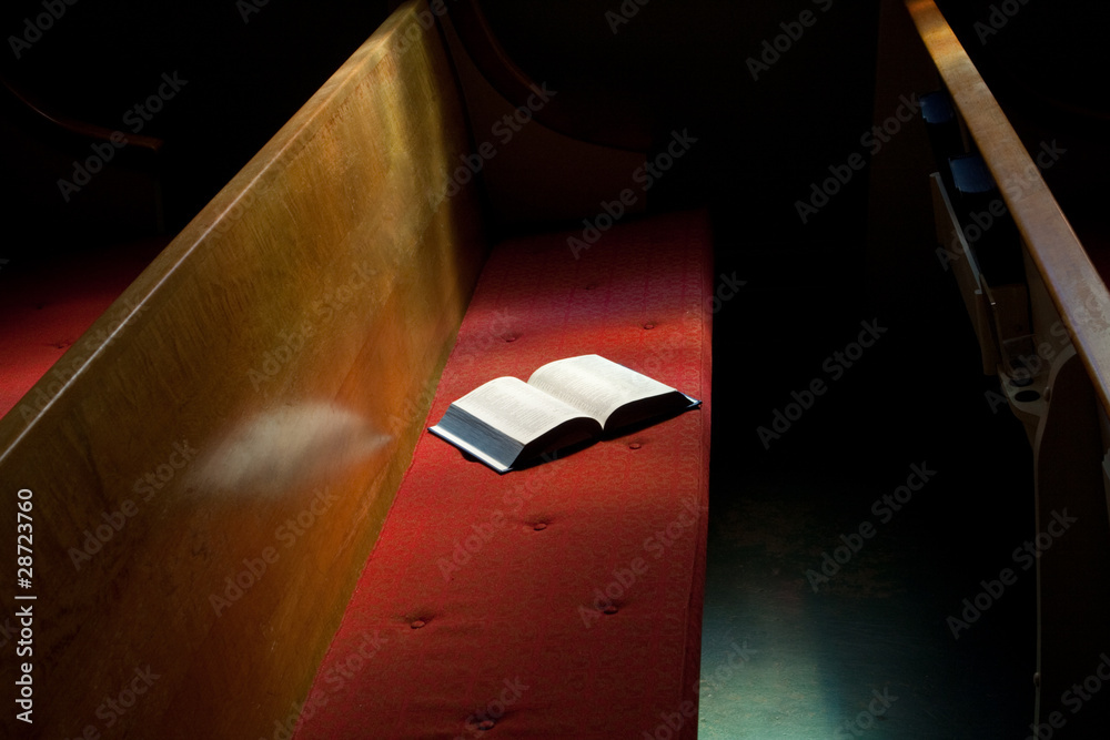 Carta da parati Open Bible Lying on Church Pew in Narrow Sunlight Band