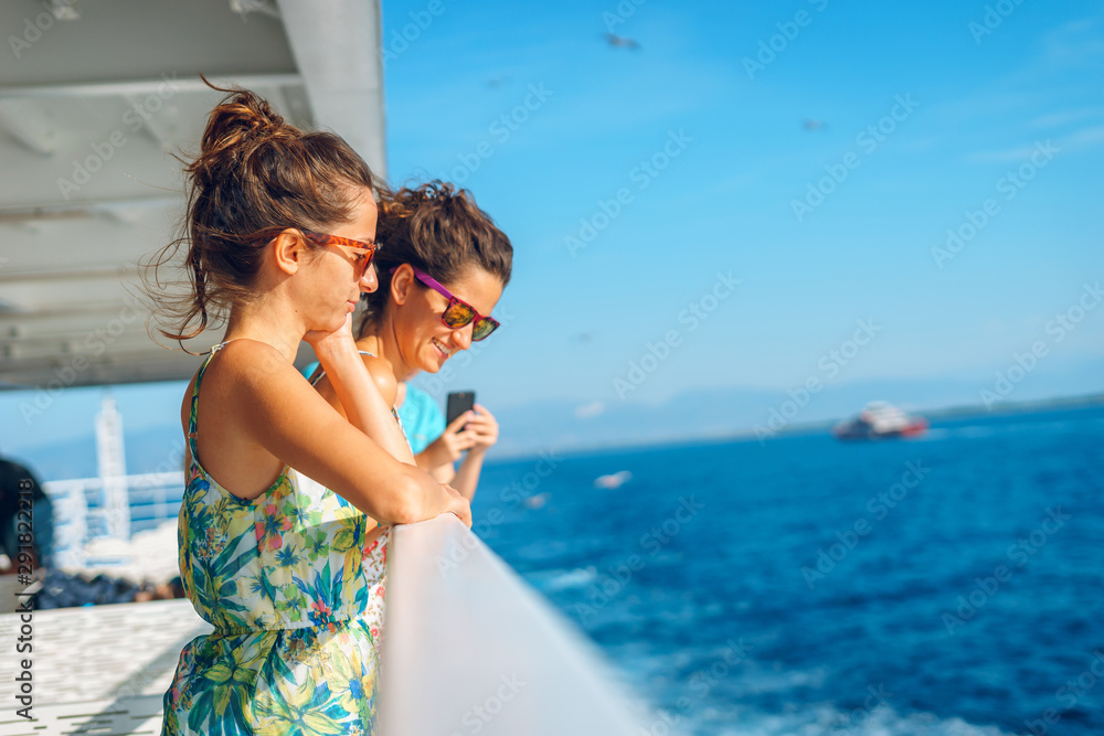 Carta da parati Two young women girl friends sisters standing by the fence on deck of the ferry