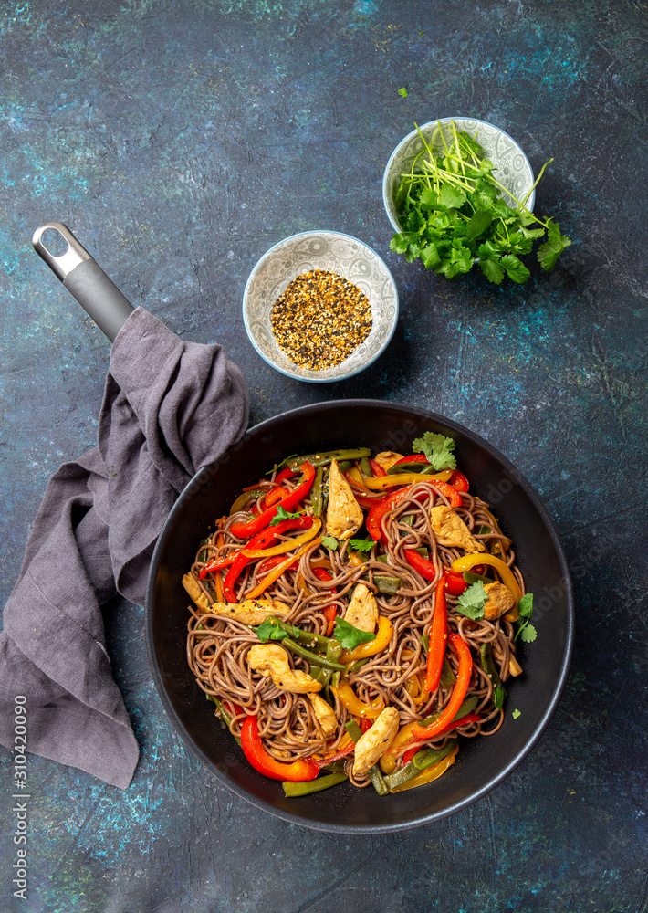 Carta da parati Japanese dish buckwheat soba noodles with chicken and vegetables carrot, bell pe