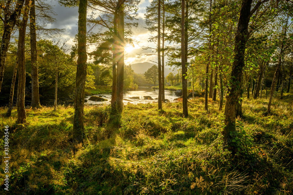 Carta da parati Sun above blackwater river through trees