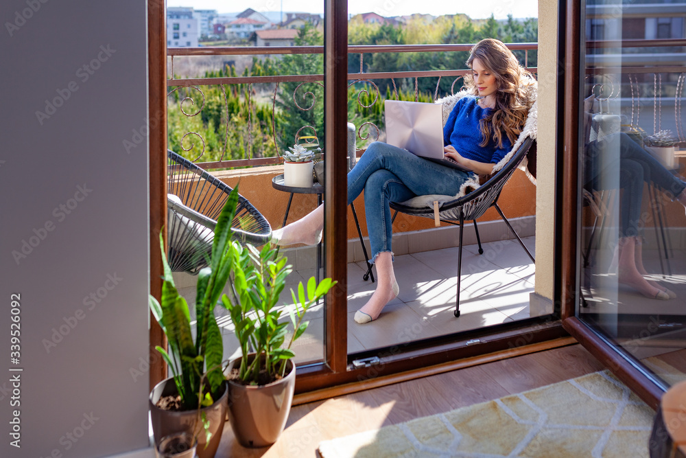 Carta da parati Beautiful young woman working from home on the balcony
