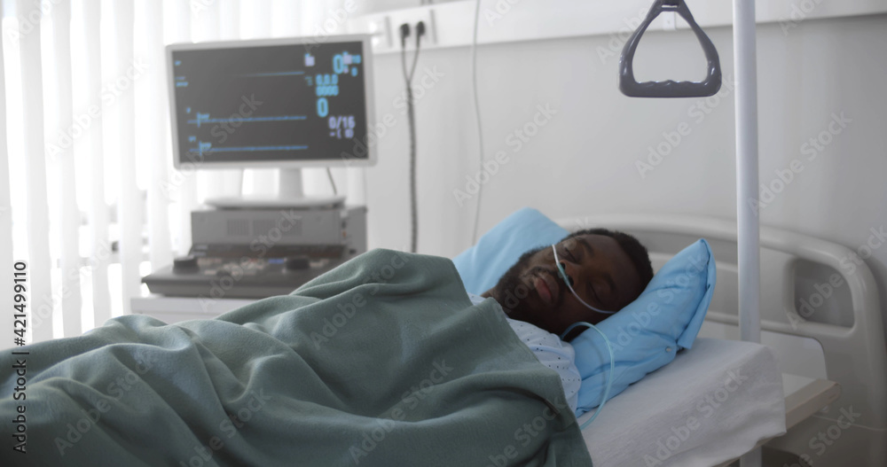 Carta da parati Portrait of afro-american man in coma dying in hospital bed with heart rate fall