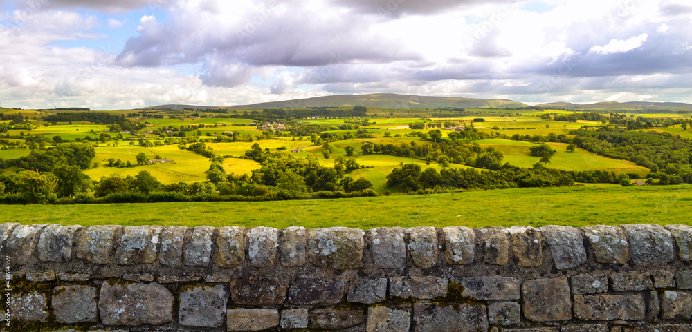 Carta da parati English countryside and farmland landscape panorama background along Hadrian's Wall Roman ruin