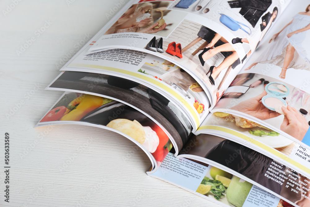 Carta da parati Many open magazines on white wooden table, above view