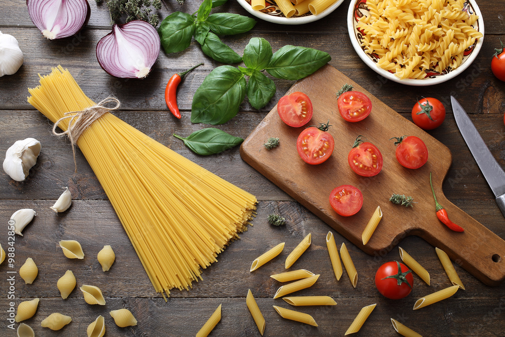Carta da parati vista dall'alto Pasta grezza con basilico e pomodoro su sfondo legno rustico