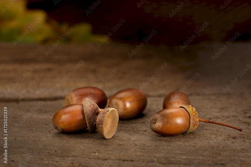 Foto Close-up of acorns on an old rustic wooden background, selective focus and copy space