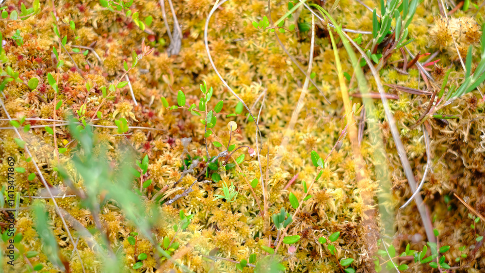 Foto Close-up view of a lush peat bog surface with vibrant sphagnum moss in yellow an