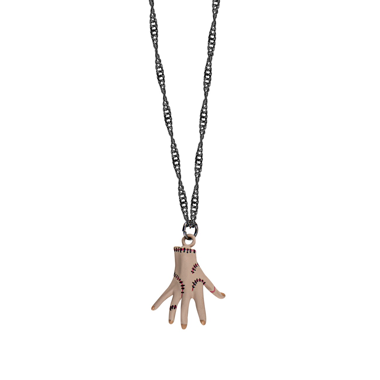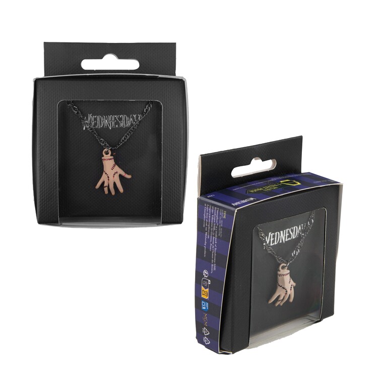 Porta sempre con te il tuo fedele aiutante – la mano iconica Thing dall’universo di Wednesday in un’elegante collana. Il ciondolo è in ottone (2,5 × 2 × 0,8 cm) e pende da una catena in ferro lunga 45 cm regolabile fino a 51 cm.
