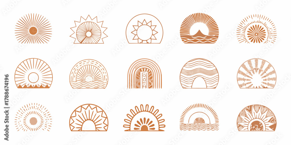 Quadro su tela Collection of boho sunburst and rainbow elements in earthy tones