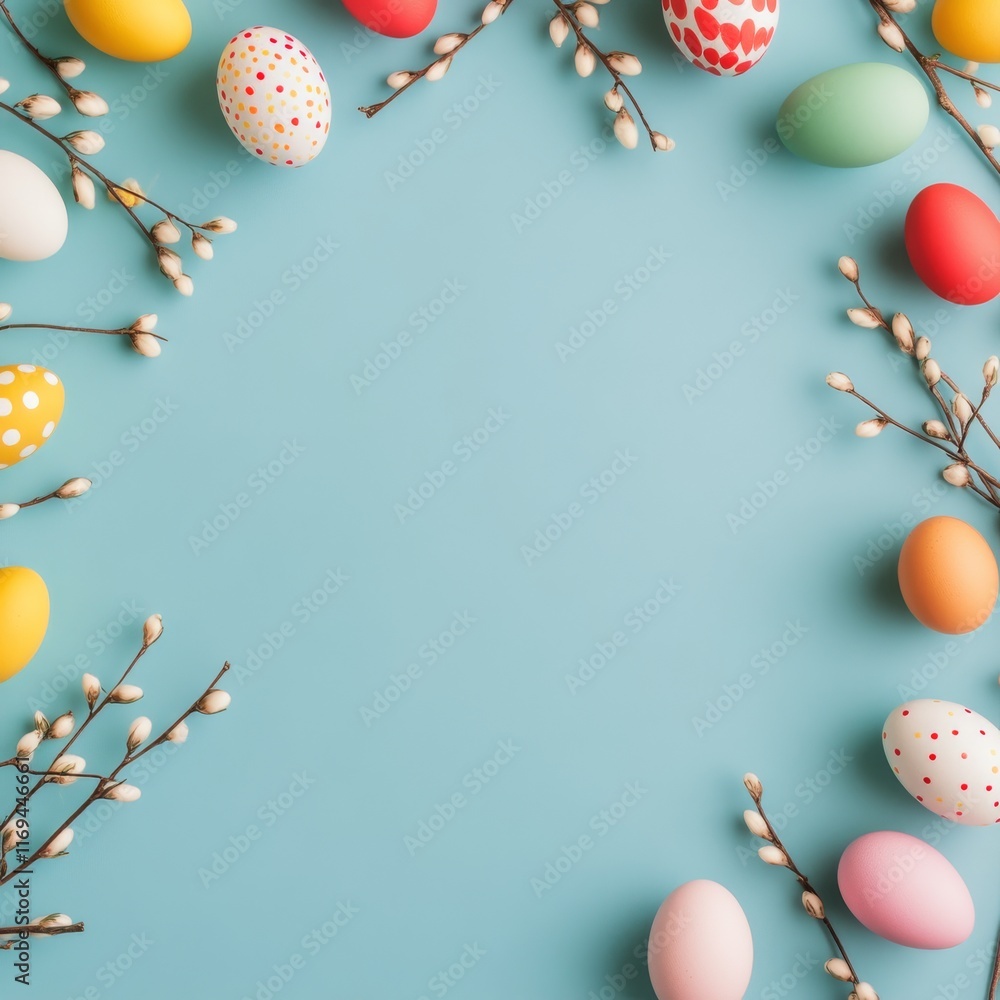 Foto Colorful Easter eggs arranged with spring branches on a blue background