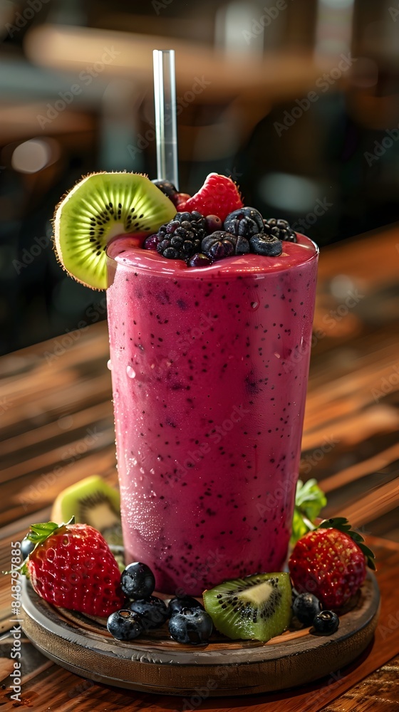 Foto Colorful Mixed Berry Smoothie Drink with Kiwi Garnish on Wooden Table