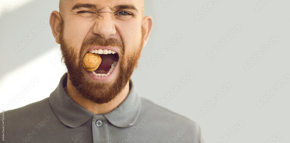 Foto Confident, charismatic, handsome man winks his eye and cracks a hard nut
