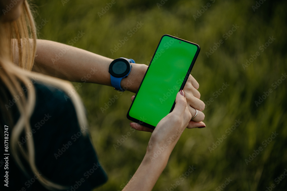 Foto Connected and Active: Against a backdrop of a green hill, a Caucasian jogger harnesses the power of technology, glancing at her smartwatch for insights on speed, distance, and calories burned