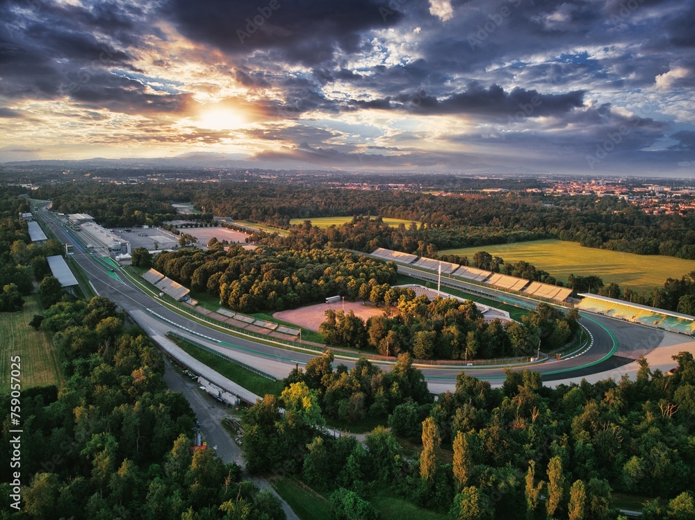 Drone shot of F1 race circuit track surrounded by greenery during sunset in Monza, Italy
