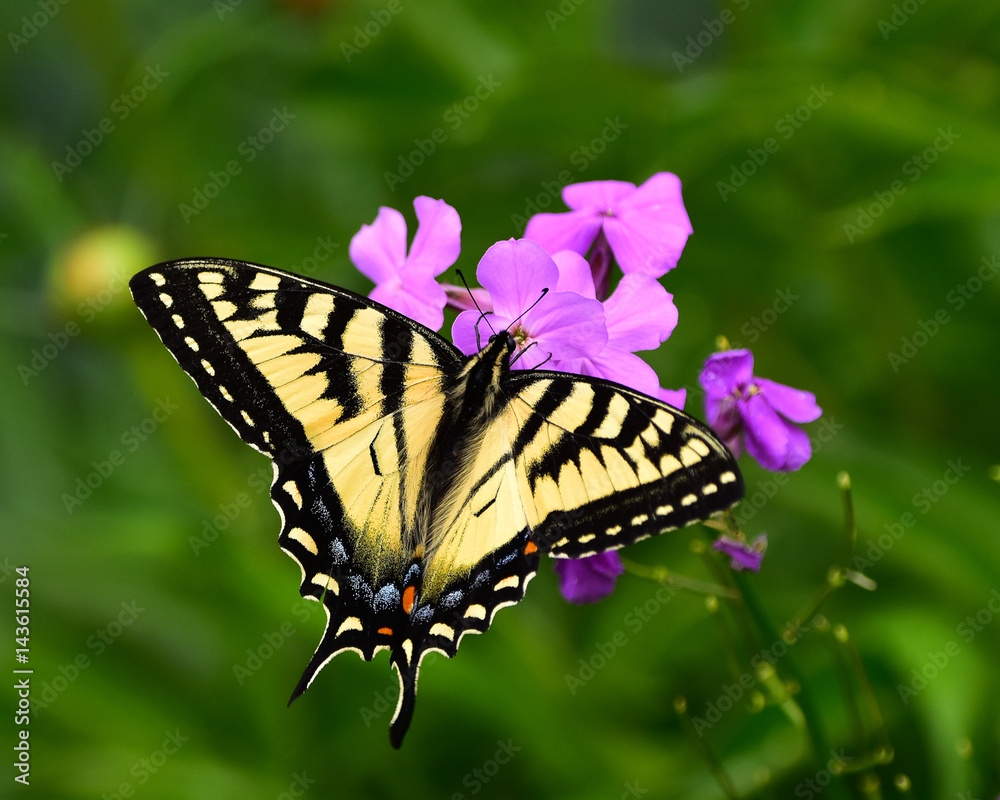 Foto Eastern swallowtail butterfly feeding on pink phlox flowers