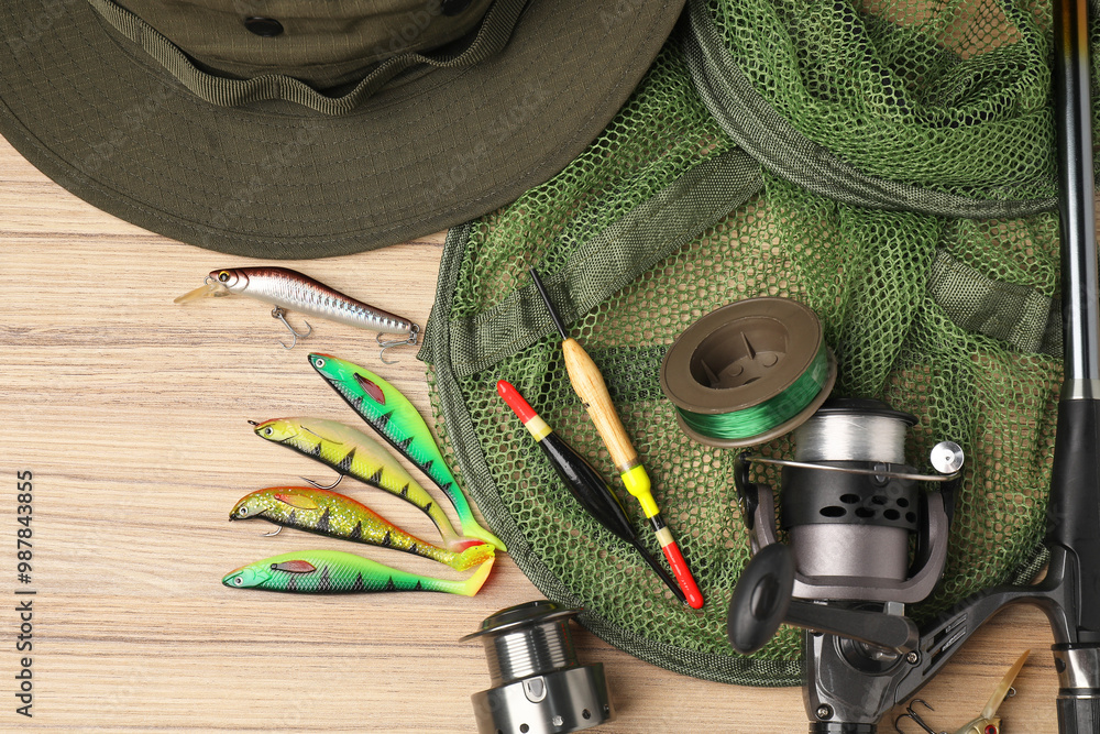 Foto Fishing rod with spinning reel, baits, hat, net, floats and line on wooden table
