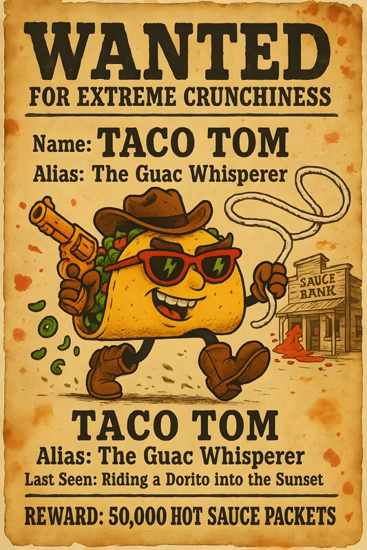 Quadro su tela Funny Taco Wanted Poster – Taco Tom Print for Kitchen or Bar
