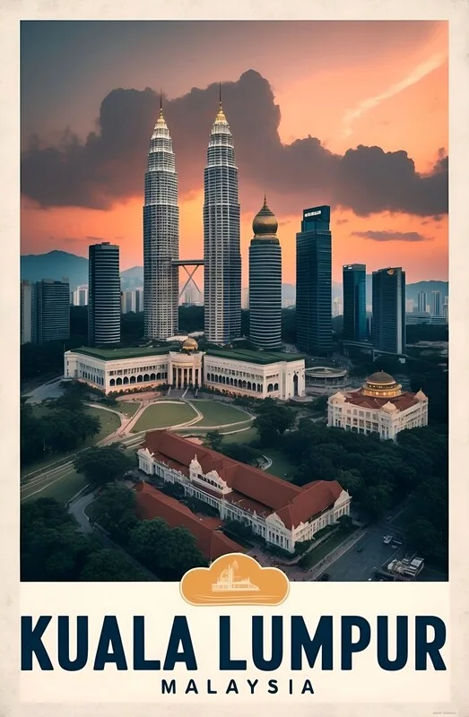 Poster Vintage Aerial Illustration of Kuala Lumpur: Timeless City